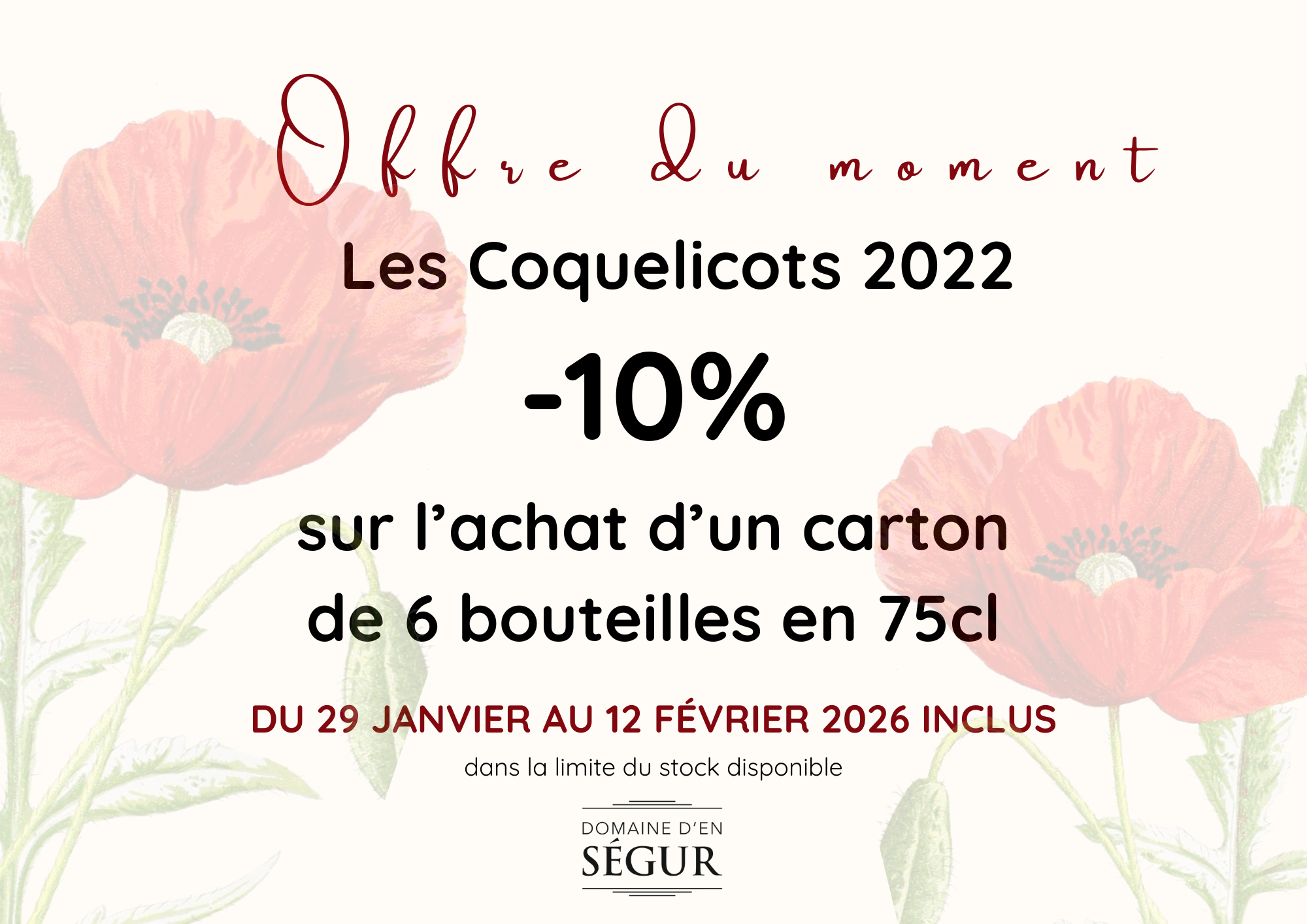 Profitez de 10 % de remise sur l’achat de 6 bouteilles 75cl de Coquelicots 2022, du 29 janvier au 12 février 2026 inclus.